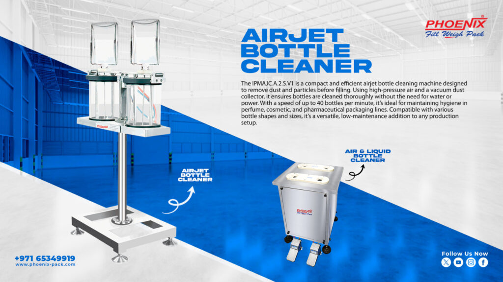 Designed to remove dust and impurities from empty bottles using high-pressure air, ensuring hygiene and product safety before filling.