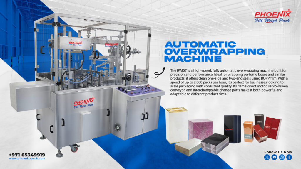 High-speed machine for wrapping perfume boxes, cosmetics, and other products with BOPP film, ensuring a secure, tamper-proof, and premium finish.